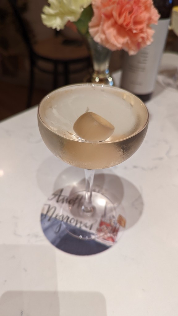 As a second drink I wanted to go with one from the normal menu and asked the waiter for his recommendations. He recommended the Oregano, explaining that it was the most unusual and eclectic drink on the menu – sounded good to me. The clarified drink features an olive oil-washed blend of rum, moussaka spice mix, tomato water, eggplant, lemon and whey. According to the menu, the cocktail was inspired by Greece but to me it tasted exactly like a slice of margarita pizza in a glass. And I don’t mean that in a bad way at all! It was creative, it was delicious and it was a hearty cocktail that was not a Bloody Mary.