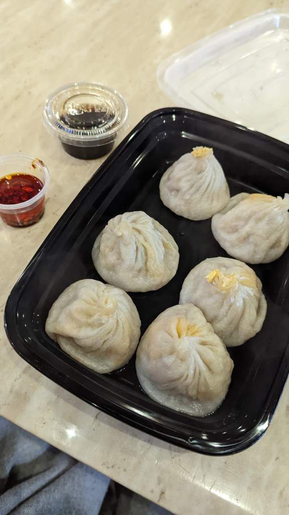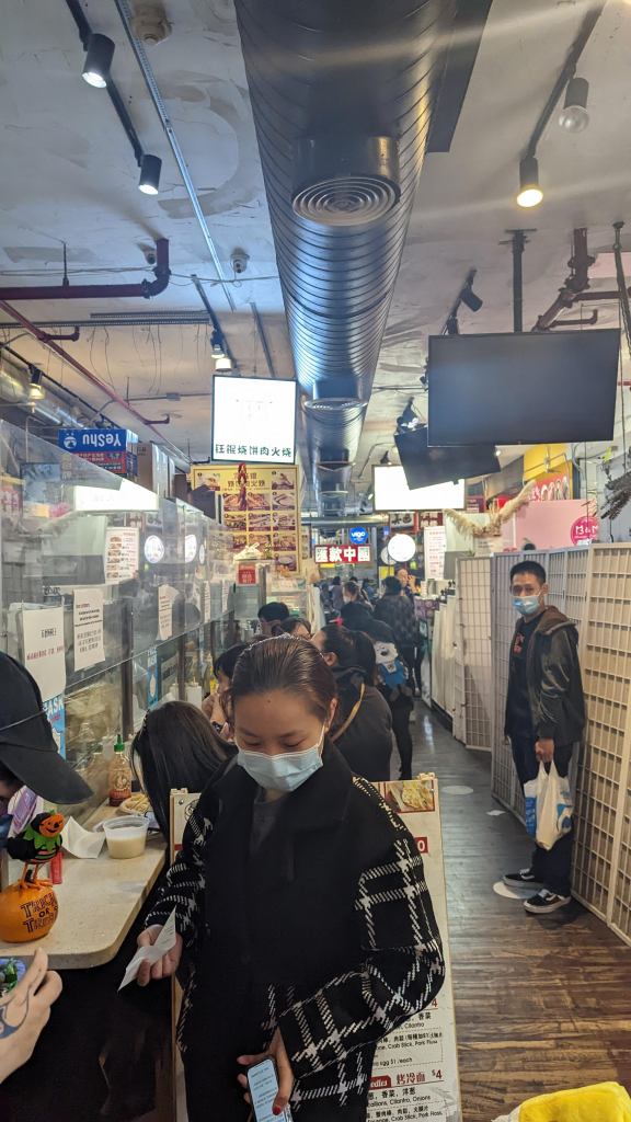On the overall atmosphere in the food court: It was loud and busy but there’s numerous seats and waiting times are short. A few of the stalls seemed a bit more westernized but most of them seemed to serve authentic Asian food (as far as I can judge) offering such things as stinky tofu (that’s what it’s called), tea eggs and lots of intestines. Sometimes there would be no English name for dishes and only photos and sometimes the servers didn’t speak English but in general that was not a problem. Some stalls take card, but I would recommend taking cash as well (that goes for all of Flushing).