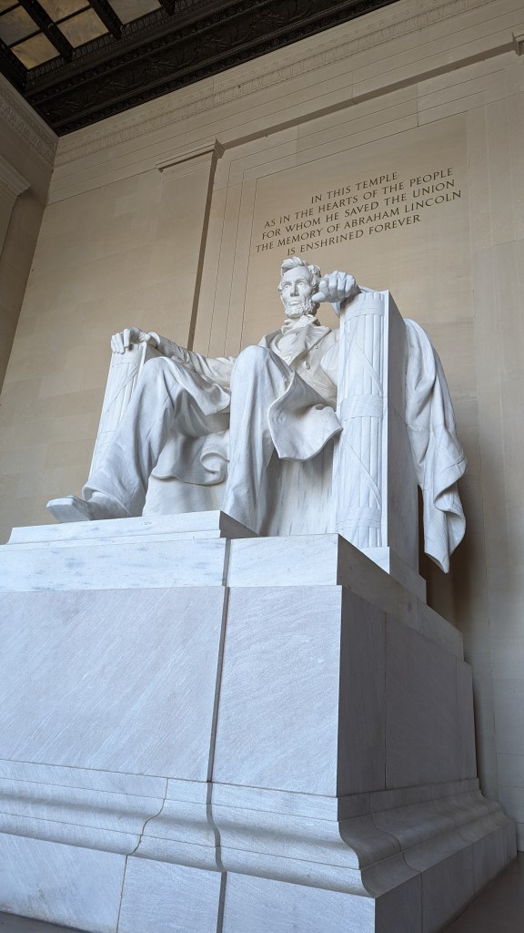 Obviously, apart from wars, the American Cultural Memory also does its best to remember past presidents and other people of importance. Lincoln has a memorial, Martin Luther King has one, Thomas Jefferson has one – even Albert Einstein has one. While most of them consisted in a statue surrended by many famous quotes of said person, Franklin D. Roosevelt’s monument was the only one that I though provided some context. I liked his memorial in particular as it was constructed as a mini outdoor museum. It guided you chronologically through his life and works, starting with a „prologue“ of a statue of him in his wheelchair. He tried to keep his worsening sickness from the American people and always had himself depicted without his aid. However, after his death, pressure from physically impaired groups and organisations grew and they demanded a more honest depiction – and they should get it. From this starting point, the monument consisted of a little path at times lined with waterfalls, quotes and a bit of context provided in the form of year dates and photos. I particularly liked that the whole monument was accessible: little models of the statues could be touched and thereby allowed blind and visually impaired people to take it in as well and the path was wheelchair accessible. You also had audio commentary at some stations. (Here’s a YouTube Tour of it, if you want to see it: Click!)