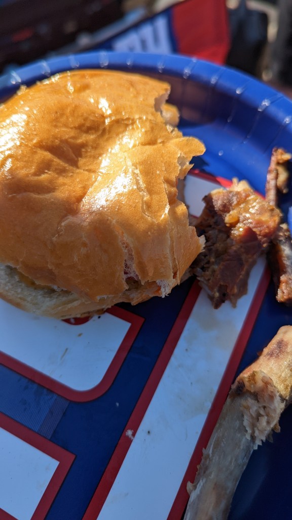 I realized quickly that I picked the right stall. The people were enormously friendly and after a one minute chat about whisky, I found myself standing there with a bottle of beer in the one hand and a plastic cup of Bourbon in the other. Turns out that the stall owners love Germany, had just come back from a trip to Ireland and Scotland and were planning to see Prague and Vienna next. From there on, conversation was easy. We had found common ground and they were happy to host me for my first tailgating. By this point, fresh beers had been opened, my Bourbon cup was refilled with 25 yo Speyside whisky and I was given a plate of freshly grilled, succulent ribs. I fully realized that I had “won at tailgating” when a seemingly loaded couple walked up to the stall, rocking matching Louis Vuitton scarfs, waving some dollar notes and asking whether they could buy a shot of whisky. They were nicely yet resolutely turned away because “food and drink is not for sale but for friends and family only”. Ha!