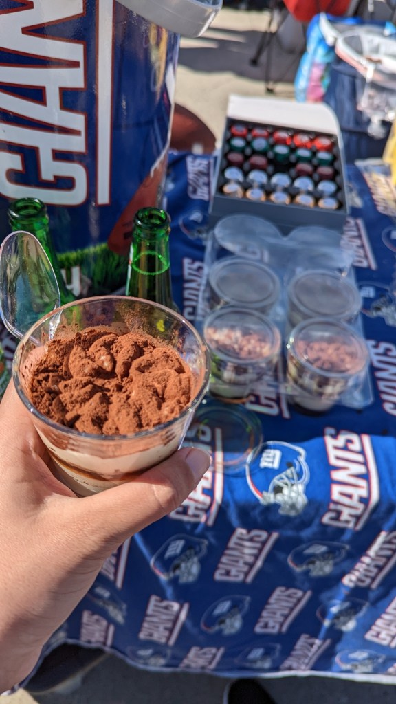 The stall owners told me that they do tailgating for every Giants home game and that the family patriarch, lover of whisky and cigars, is the mastermind behind it all. Quote from his wife: “He just loves feeding people.” He even seemed a bit apologetic that this time he could “only” feed me ribs and burgers, when for past tailgating experiences he had brought oysters, made a seven fish stew and had even cooked some lobsters at the carpark. I swore that I was totally happy with that and continued happily eating my body weight in ribs. I hadn’t even noticed that the family had already turned the salad bar into a dessert buffet featuring Tiramisu, fresh fruit, donuts and an assortment of boozy chocolates. I was in tailgating heaven!